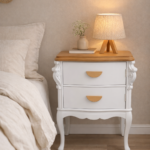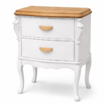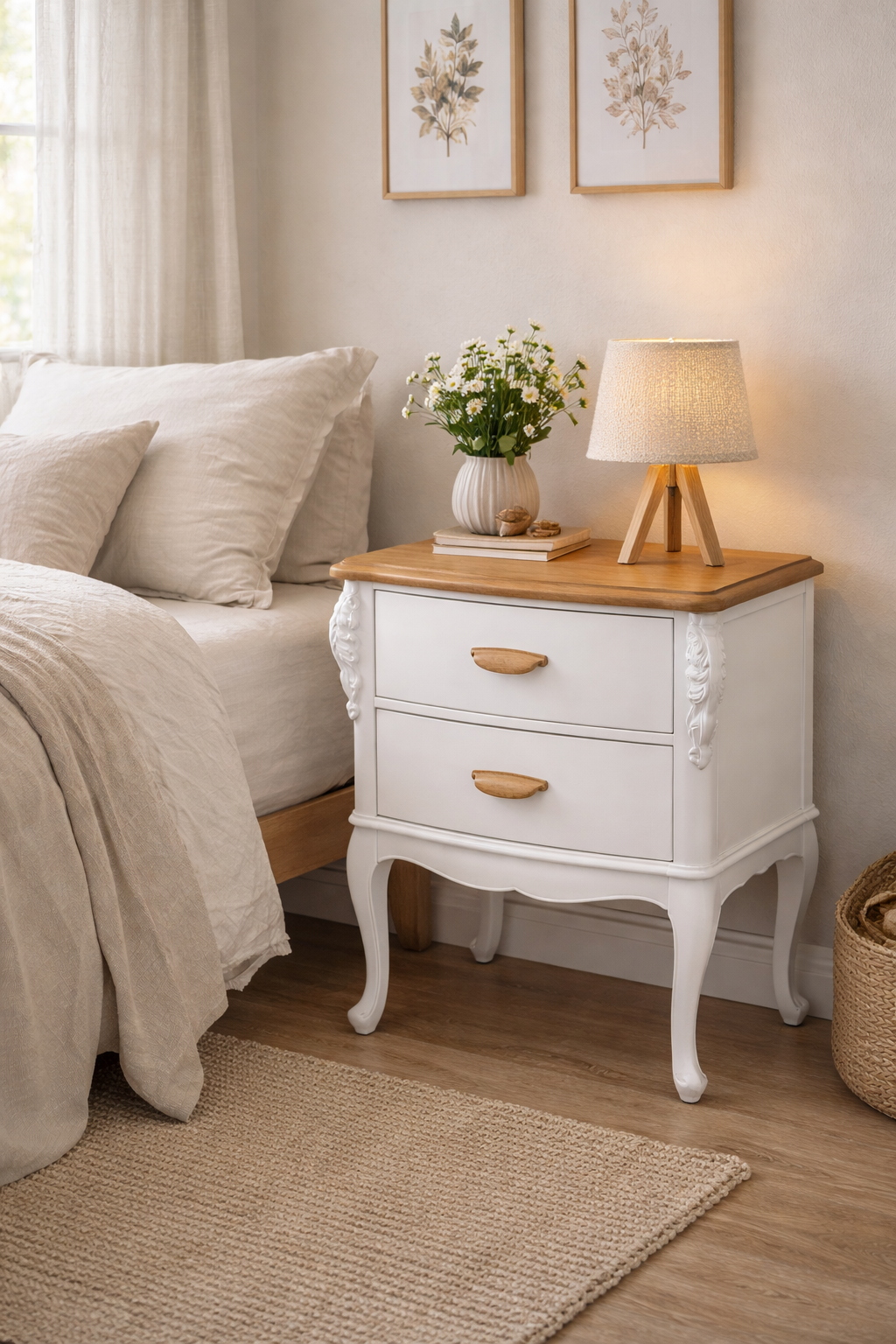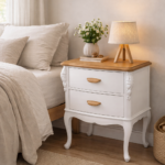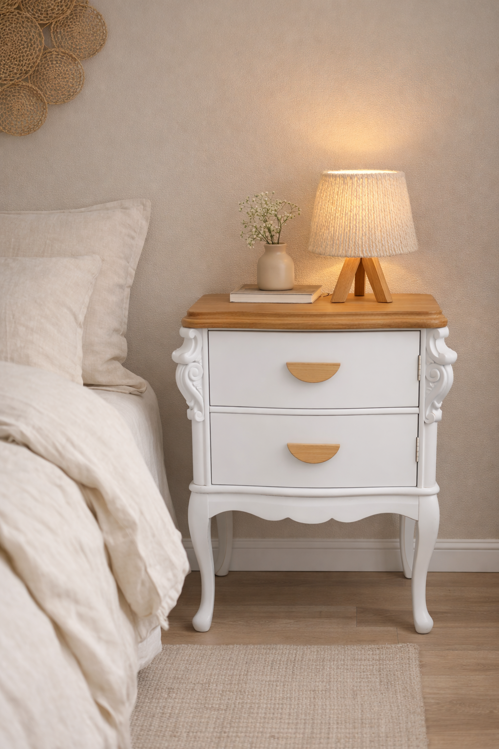 Mesa de luz de madera restaurada a mano, combinando blanco suave con tapa en madera natural que aporta calidez y un estilo elegante. Sus tiradores de madera le dan un toque moderno manteniendo el encanto de su diseño clásico con patas curvas.