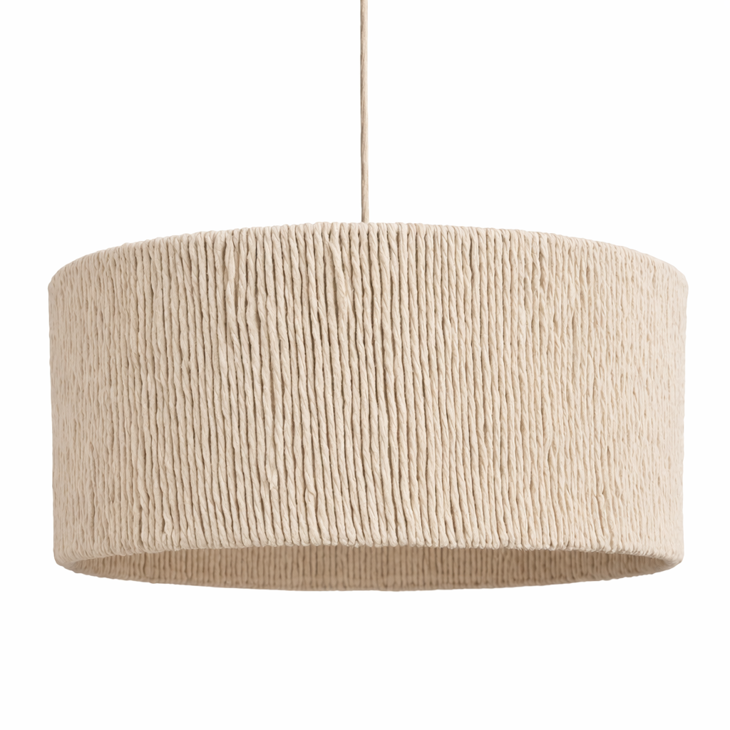 Hilo tejido a mano sobre estructura metálica. Su diseño redondo y texturado aporta calidez y estilo natural, creando una luz suave y acogedora ideal para livings, dormitorios o comedores.